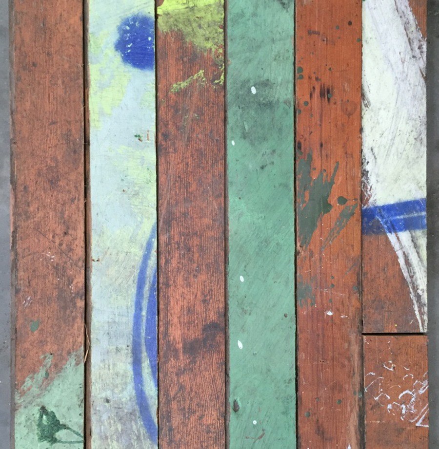 Reclaimed 90mm (3 1/2 inch) pitch pine art room strip floor from a 1920s school. These old wooden boards are full of character with many layers and splashes of paint built up over decades of use. This batch of reclaimed strip flooring will make a great floor but probably even better unique wall cladding for a bar or restaurant. Reserved for Karim.
