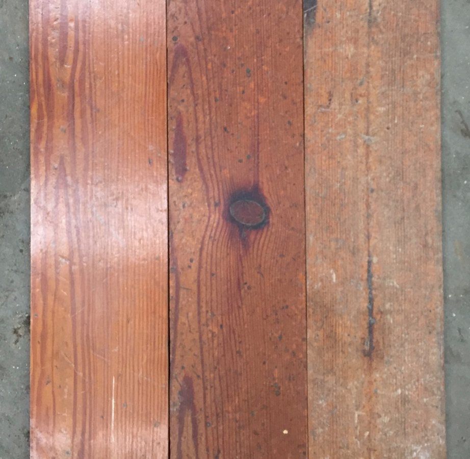 Reclaimed pitch pine floorboards 140mm (5 1/2 inch) wide. These rare pitch pine boards were originally tongue and groove which we have machined down to square edged boards to enable easy fitting.